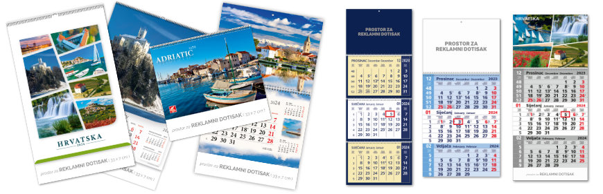 Kalendari su popularno učinkovito sredstvo koje Vas prati 365 dana u godini i kao takvo idealan je poslovni poklon Vašim partnerima. U ponudi imamo zidne kalendare, stolne (cd) kalendare, te tromjesečne kalendare.