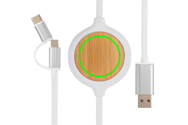 Unique bamboo design 3-in-1 charging cable with integrated 5W wireless charger. The 100 cm cable is made from PVC free TPE material. With type C and double-sided connector for IOS and Android devices that require micro usb. With integrated 5W wireless charger to charge your device by simply placing it on the charging surface. Input: 5V/2A. 9V/2A. Wireless output: 5V1A, 9V/1.1A. Cable output max 5V/1A.