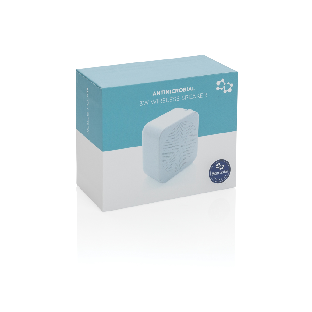 3W wireless speaker that is treated with Biomaster, an Anti-Microbial agent that provides a second line of defence against harmful bacteria. It is IN the product, not ON the product which will give you permanent protection. This product has been tested in accordance with ISO 22196 for Anti-Microbial effectiveness and is 100% safe and harmless for users. Biomaster does also not affect the recyclability of the item. The product also includes Verimaster a unique tracer that is built into the material to prove that the item is treated with Biomaster, unlike many products in the market that make antimicrobial claims that are counterfeit. The speaker has a 300 mah battery that allows a play time up to 2 hours and can be re-charged in 1.5 hours. With BT 5 that allows an operating distance up to 10 metres. Packed in luxury gift box including Biomaster explanation. Including TPE PVC free micro charging cable.