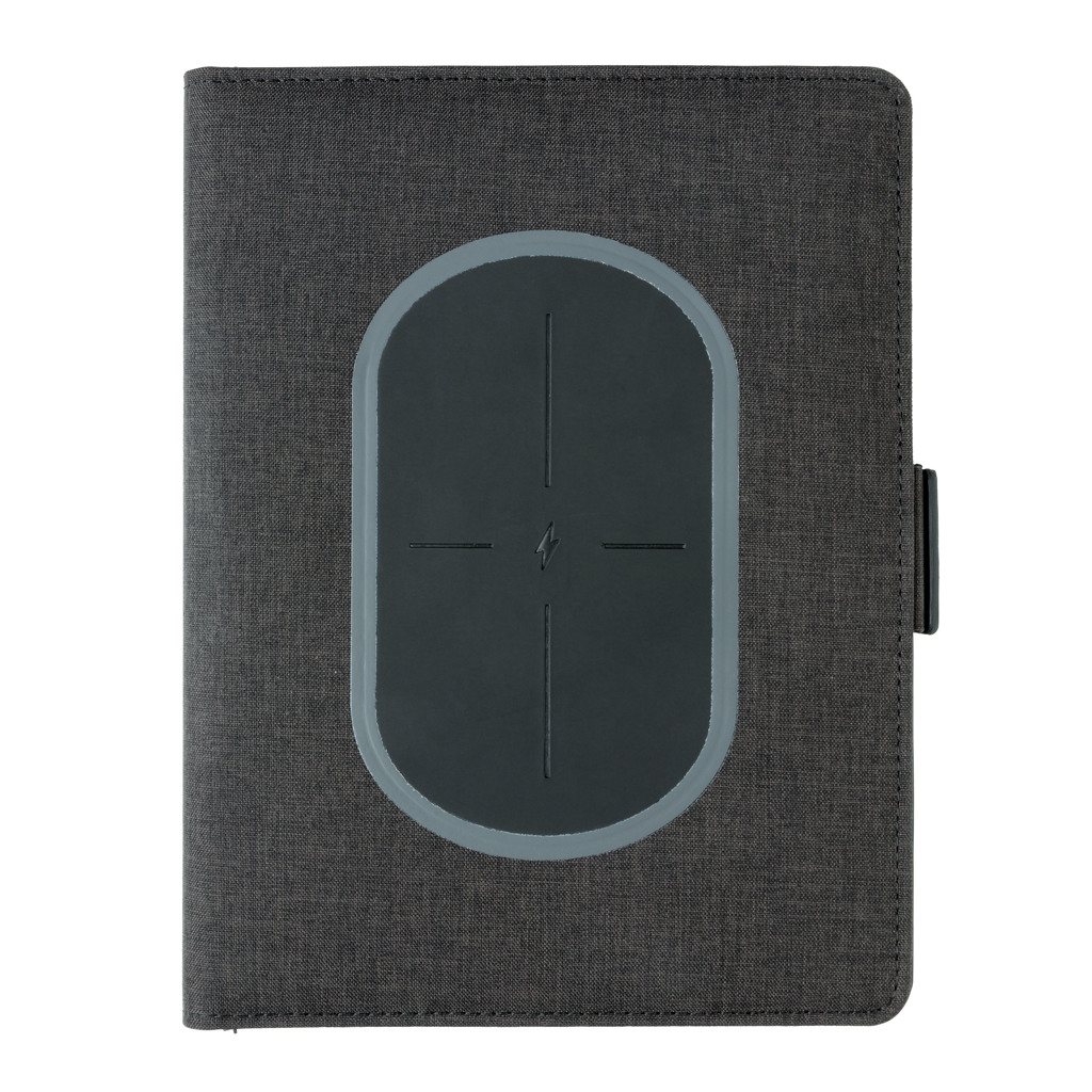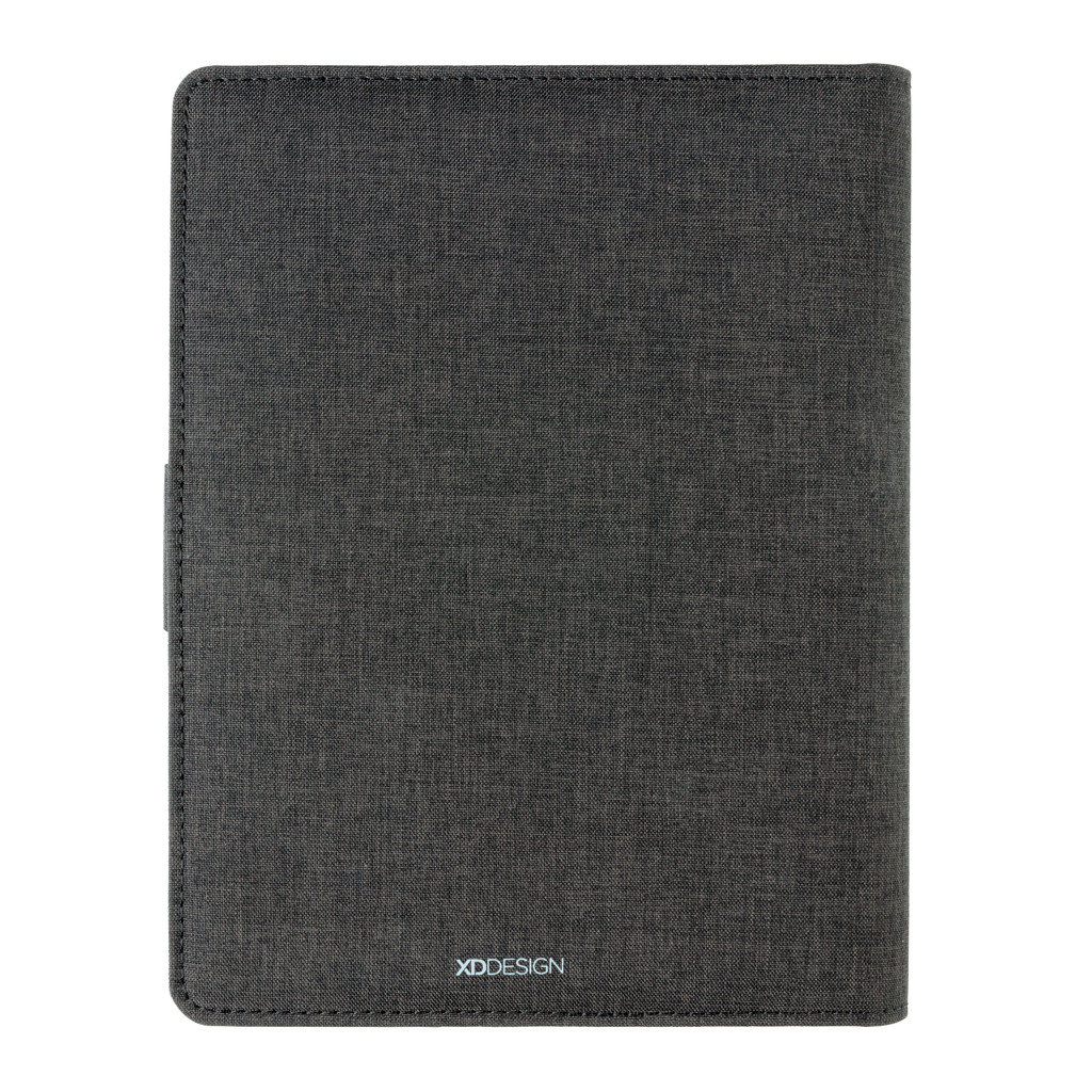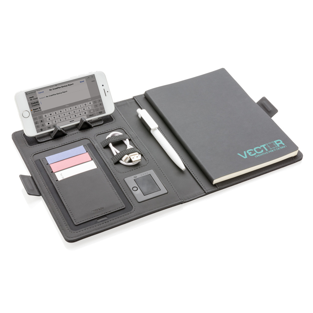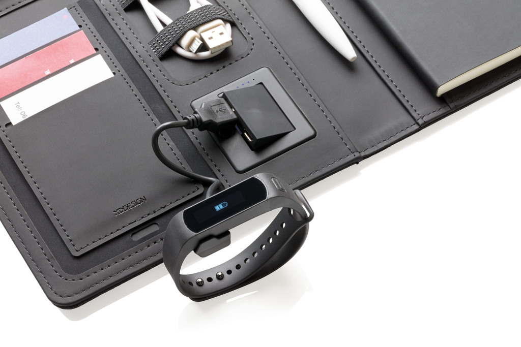 This notebook cover with removable notebook (128 lined pages of 80 gsm) boasts the latest technology. The front cover has a wireless charging pad for your phone. (Android latest generations, iPhone 8 and up). Older phones and tablets can be charged via the USB ports from the 4.000 mAh powerbank. The unique USB ports pop up with a simple click of a button. Input: 5.0V/1.0A. Output: 5.0V/2.1A. Wireless Output: 5W. Registered design®
