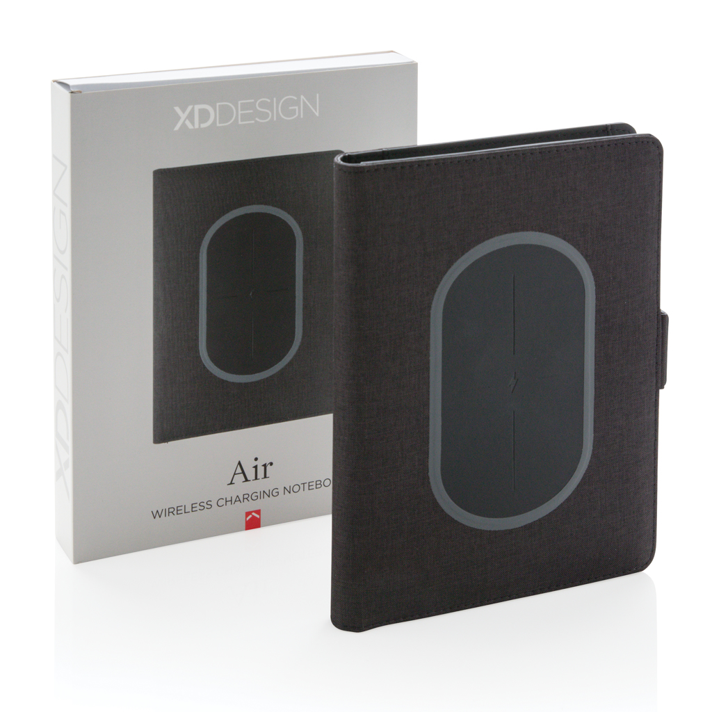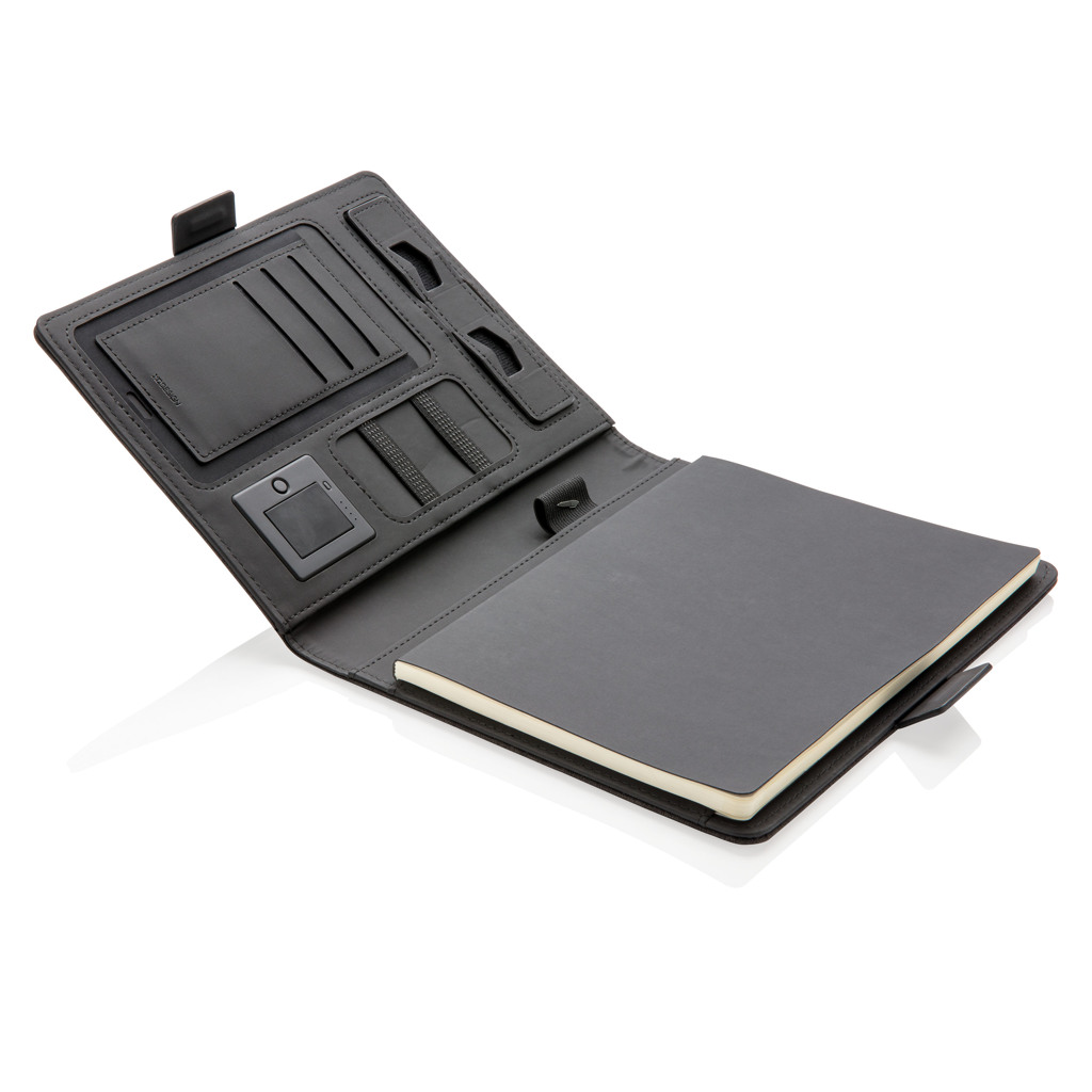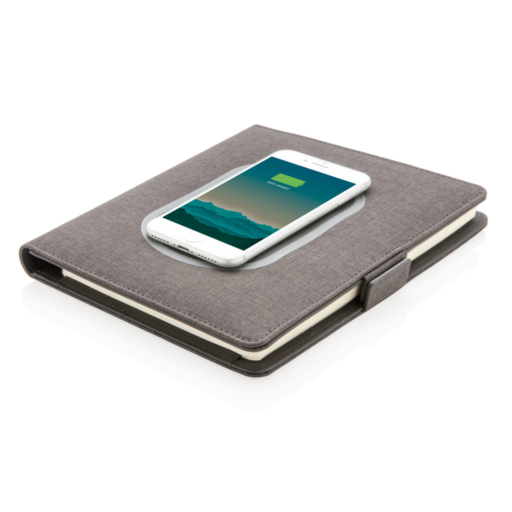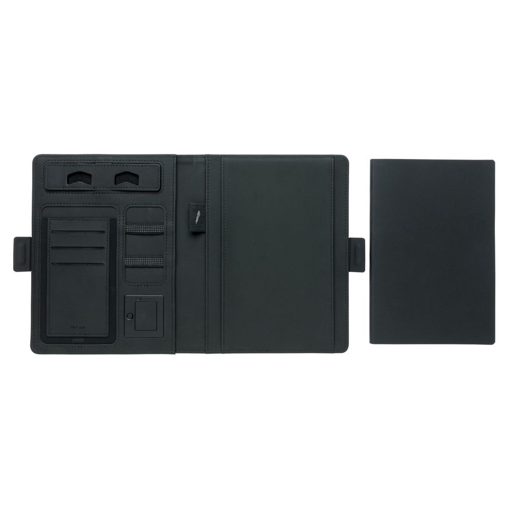 This notebook cover with removable notebook (128 lined pages of 80 gsm) boasts the latest technology. The front cover has a wireless charging pad for your phone. (Android latest generations, iPhone 8 and up). Older phones and tablets can be charged via the USB ports from the 4.000 mAh powerbank. The unique USB ports pop up with a simple click of a button. Input: 5.0V/1.0A. Output: 5.0V/2.1A. Wireless Output: 5W. Registered design®