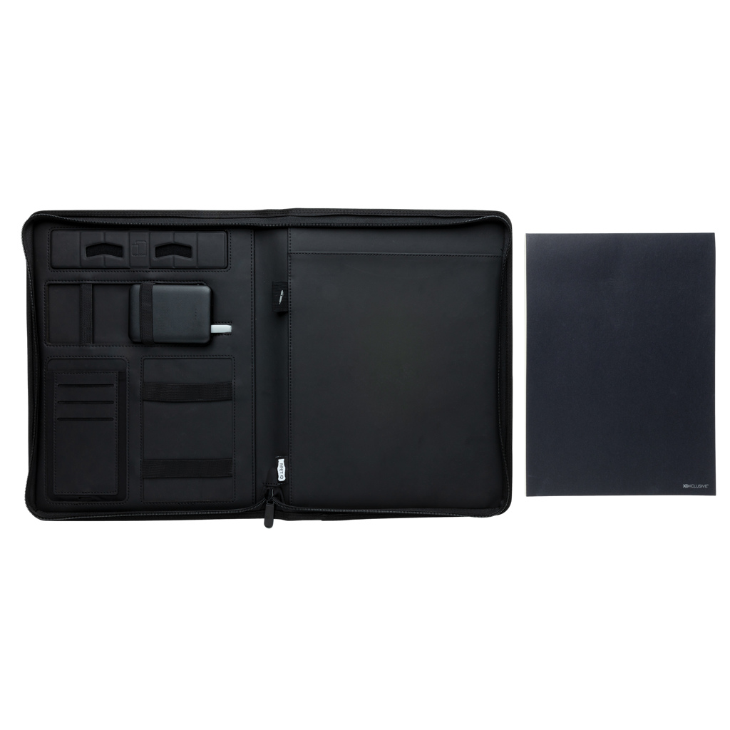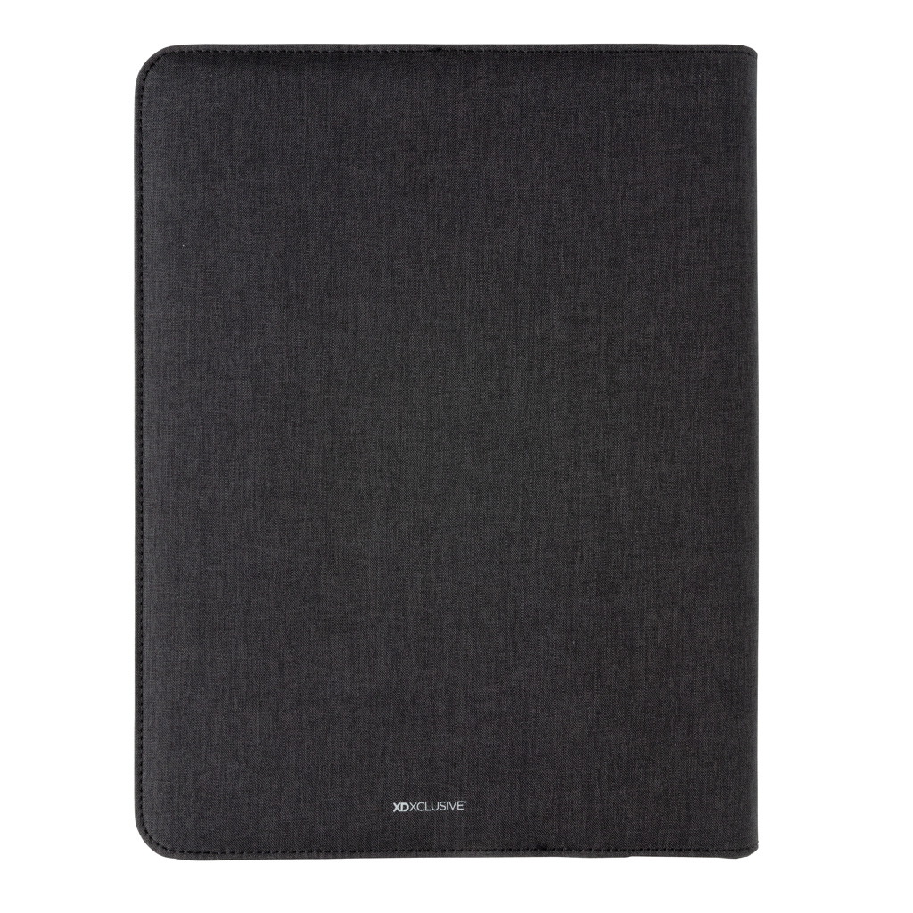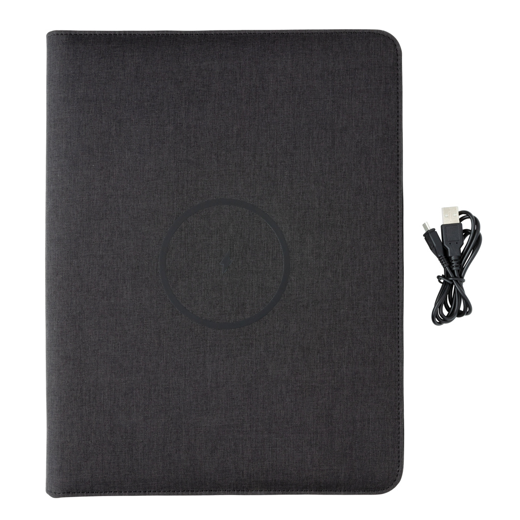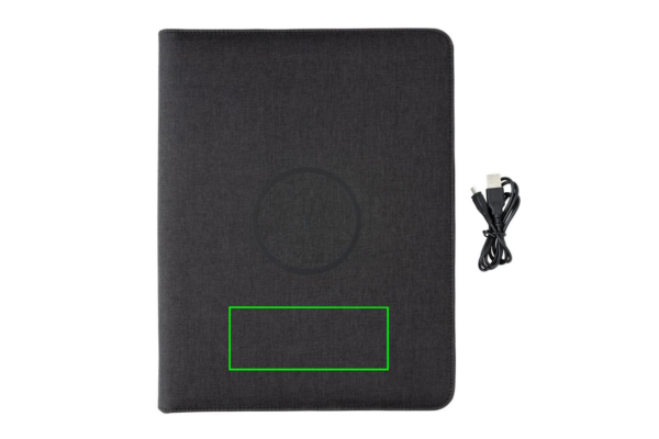 This A4 portfolio with cream coloured 20 sheets 70 grams lined notepad boasts the latest technology. The front cover has a wireless charging pad for your phone. (Android latest generations, iPhone 8 and up). Older phones and tablets can be charged via the USB ports with the external 5.000 mAh powerbank. Input: 5.0V/2.1A. Output 1: 5.0V/2.1A. Output 2: 5.0V/2.1A.Wireless Output: 5W. Registered design®