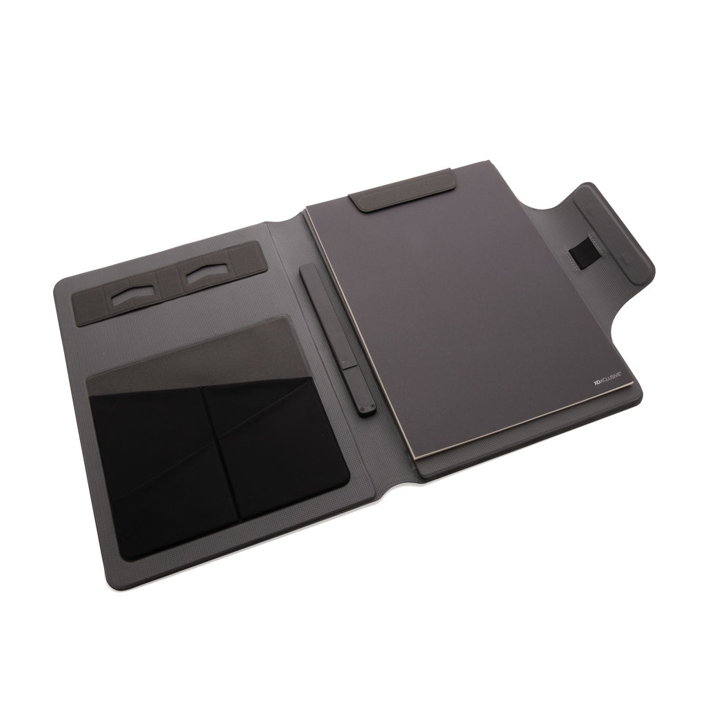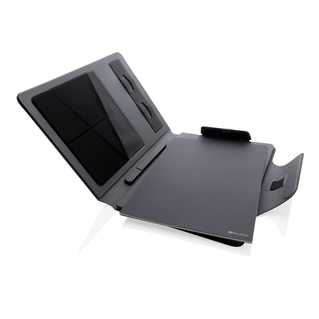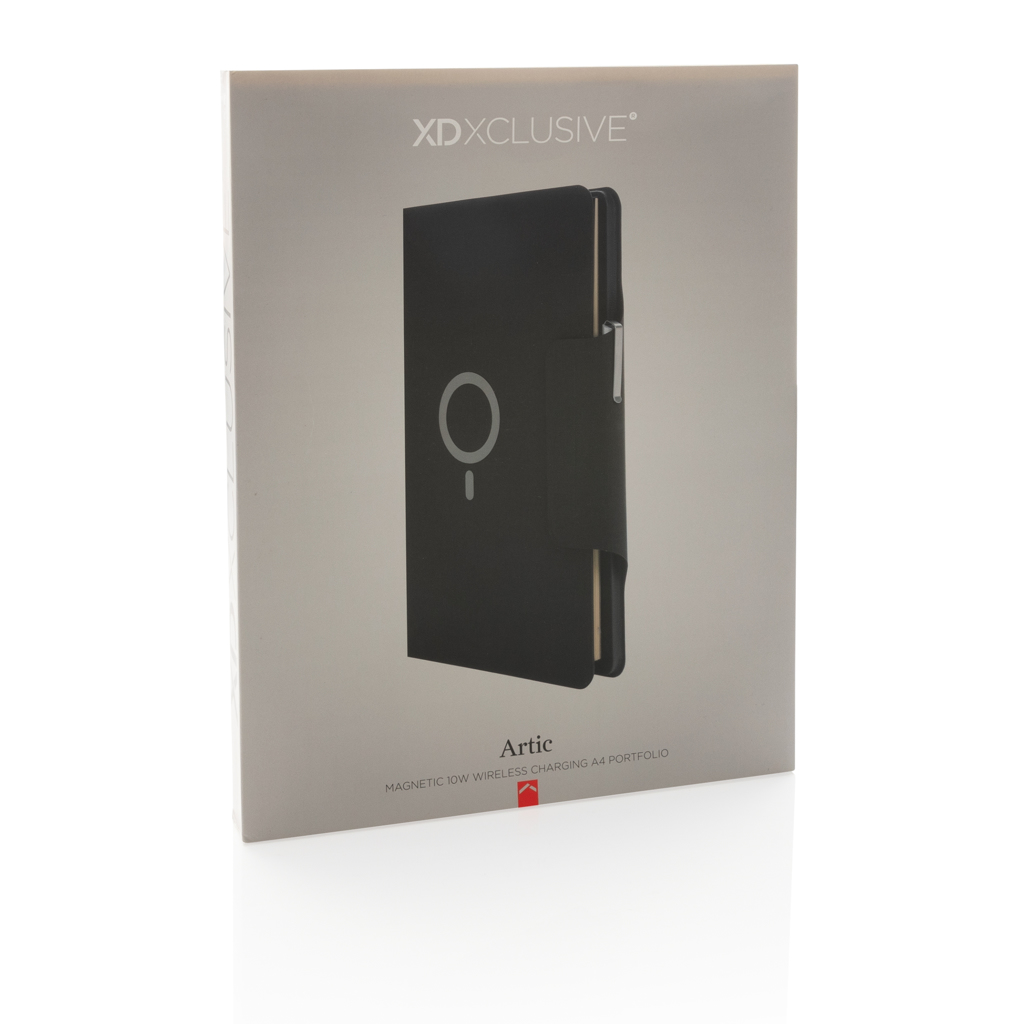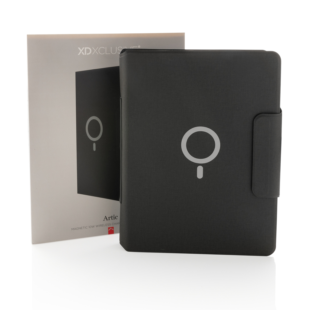 Charge your mobile device wirelessly at full speed with this A4 PU material notebook portfolio with integrated magnetic 10W wireless charger and 8000 mah powerbank. Snap your phone (iPhone 12 or higher) to the wireless charger and the phone will align perfectly with the magnets inside. The 10W wireless charger is compatible with all QI devices (Iphone 8 and up and Android devices) Type-C input 9V/2A; Wireless Output 9V/1.1A; Type-C output 9V/2A. The notebook includes 20 sheets/40 pages of 80 gsm lined paper. With phone/tablet pocket and pen loop. 19 pcs high quality N52H heat resistant magnets integrated. Registered design.
