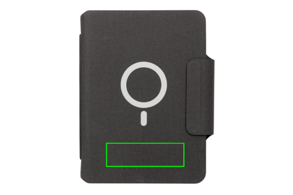 Charge your mobile device wirelessly at full speed with this A5 PU material notebook with integrated magnetic 10W wireless charger and 8000 mah powerbank. Snap your phone (iPhone 12 or higher) to the wireless charger and the phone will align perfectly with the magnets inside. The 10W wireless charger is compatible with all QI devices (Iphone 8 and up and Android devices) Type-C input 9V/2A; Wireless Output 9V/1.1A; Type-C output 9V/2A. The notebook includes 64 sheets/128 pages of 80 gsm lined paper. With phone/tablet pocket and pen loop. 19 pcs high quality N52H heat resistant magnets integrated. Registered design.