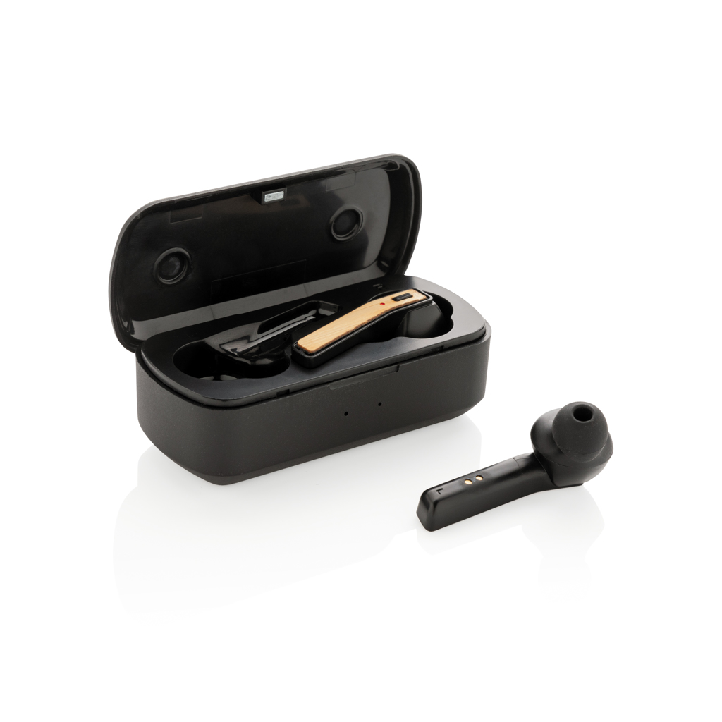 Let the music flow with these true wireless earbuds in charging case. The bamboo earbuds have a 35 mAh battery and can be re-charged in the 500 mAh charging case within 1 hour. With auto pairing function so easy to pair to your mobile device. Playing time on medium volume about 3 hours. With BT 5.0 for optimal connection. Operating distance up to 10 metres. With pick up and mic. Including 3 size silicone ear tips. Bamboo and ABS material.
