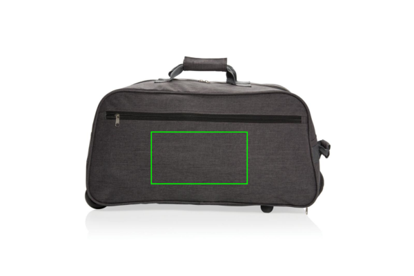 600D high density extra strong two tone polyester fabric. With extendable trolley system. One front pocket and one zipper closure main compartment.