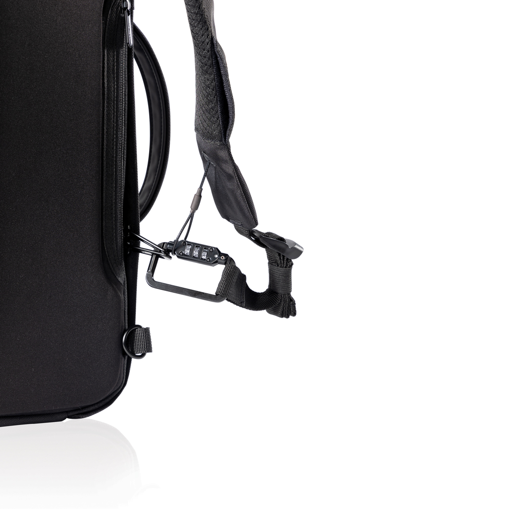 Keep your belongings safe and make your commute more stylish with the new Bobby Bizz 2.0. Ready for any business occasion, you can convert this backpack into a briefcase in a matter of seconds, just by putting the shoulder straps in the back pocket. To keep you and your belongings safe, the iconic Bobby anti-theft design has no front access, hidden zippers, and a hidden RFID-protected pocket. It is enhanced with cut-resistant material and a built-in metal frame. The improved EVA back panel provides additional comfort. You can also securely lock your Bobby Bizz 2.0 to any fixed object with the integrated zinc alloy lock in the right strap. In the backpack interior, there are padded compartments for a 16” laptop, a tablet up to 12.9”, and all your professional gear. Now made from R-pet fabric with the AWARE™ tracer. With AWARE™, the use of genuine recycled fabric is guaranteed. 33% recycled content.