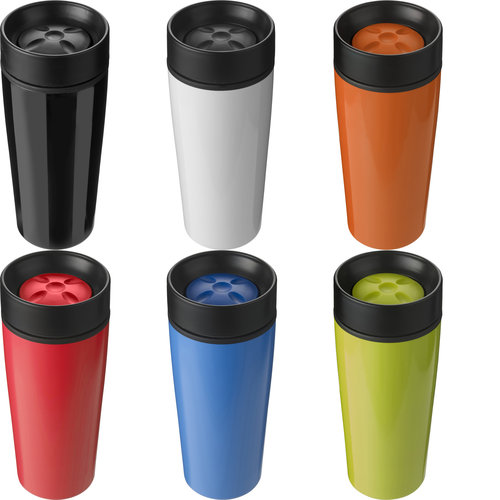 Stainless steel, double walled travel mug (450 ml) with plastic interior, and push button on the cap, supplied in a white gift box.