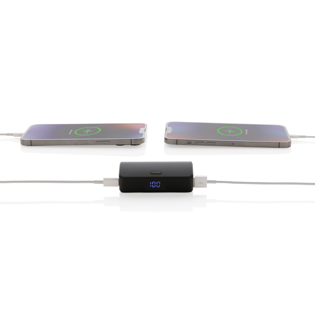 5.000 mAh pocket size 20W PD powerbank where the case is made out of RCS certified recycled ABS plastic. RCS (Recycled Claim Standard) is a standard to verify the recycled content of a product throughout the whole supply chain. Total recycled content: 21 % based on total item weight. With its sleek and space-saving design, Flashcharge is remarkably compact, ensuring you can carry it effortlessly wherever you go. Experience lightning-fast charging for both iOS and Android devices. No more long waiting times; this powerbank ensures your devices reach full power in record time. The powerbank itself supports 18W fast re-charging so the powerbank can re-charged faster than a regular powerbank. Equipped with a Quick Charge 3.0 USB-A port and a 20W PD Type-C port, you can charge multiple devices simultaneously, without compromising on charging speed. Keep track of your power reserve with the integrated LED screen, ensuring you’re never caught with a depleted battery when you need it most.