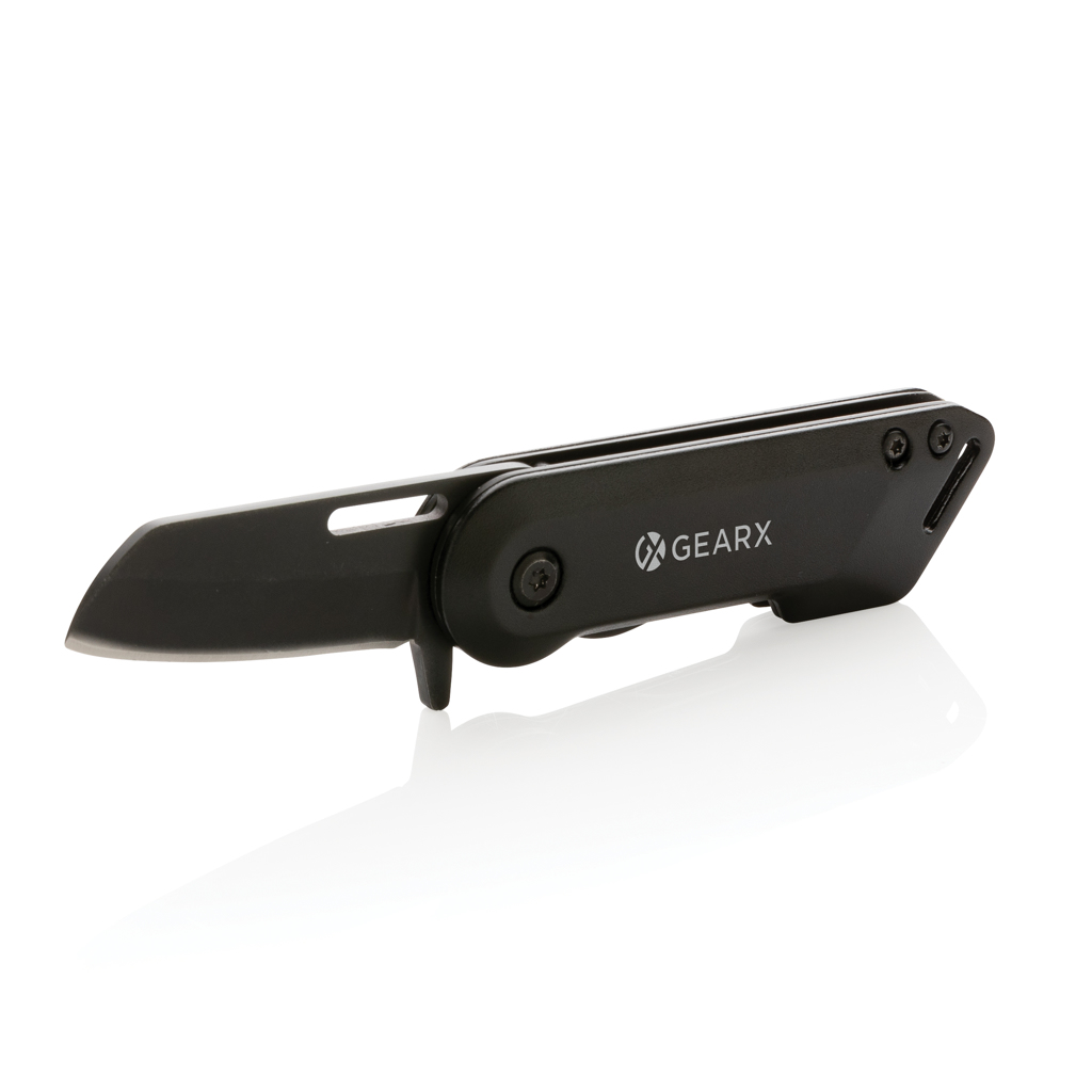 Minimal design meets strong performance with this pocket size folding knife. The fully black folding knife is made from luxury aluminum and premium grade 420 stainless steel. The long lasting knife is easy to use and lock into place. The strong design makes it the perfect knife for both outdoor and indoor use. Packed in luxury gift box.