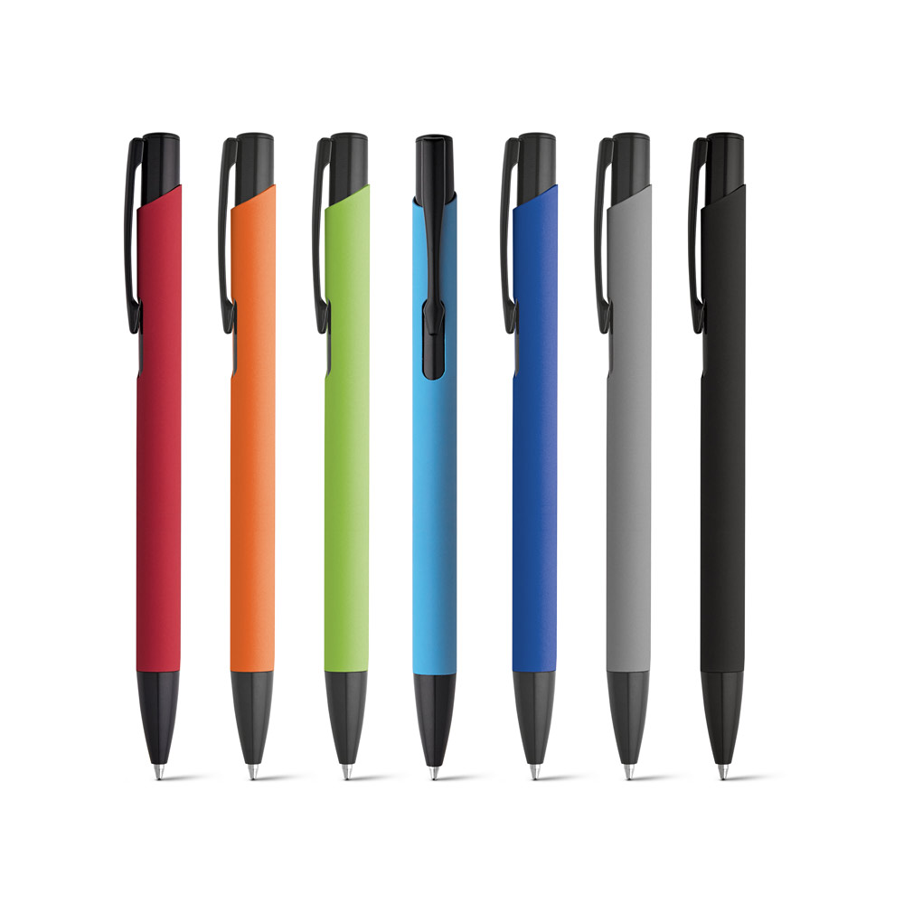 Aluminijska kemijska olovka s tijelom u boji i gumenim završnim slojem. Dostupna u širokoj paleti boja. Plava tinta. ø10 x 137 mm
