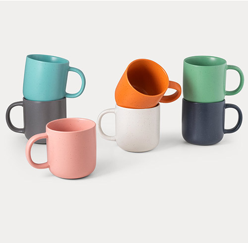 Keramička šalica s mat završnom obradom i pjegavom vanjštinom šalice. Kapacitet do 370 mL. Isporučuje se u poklon kutiji od kraft papira. Šalica se može prati u perilici posuđa i otporna je na najmanje 125 ciklusa pranja (uključujući tisak) prema EN12875-1. 85 x 85 mm