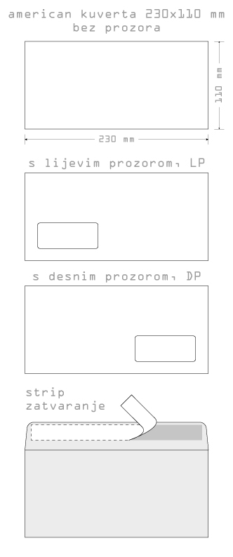 U pravilu se proizvode strojno, a najčešće upotrebljavana koverta je popularno zvana “American format” 230×110 mm.