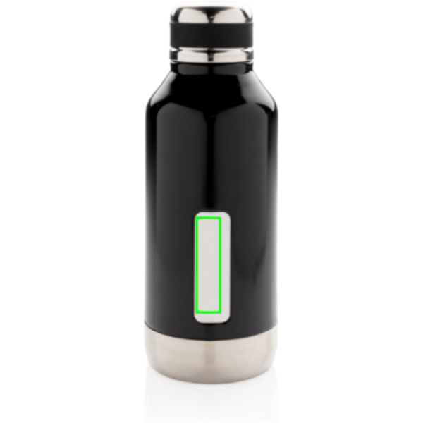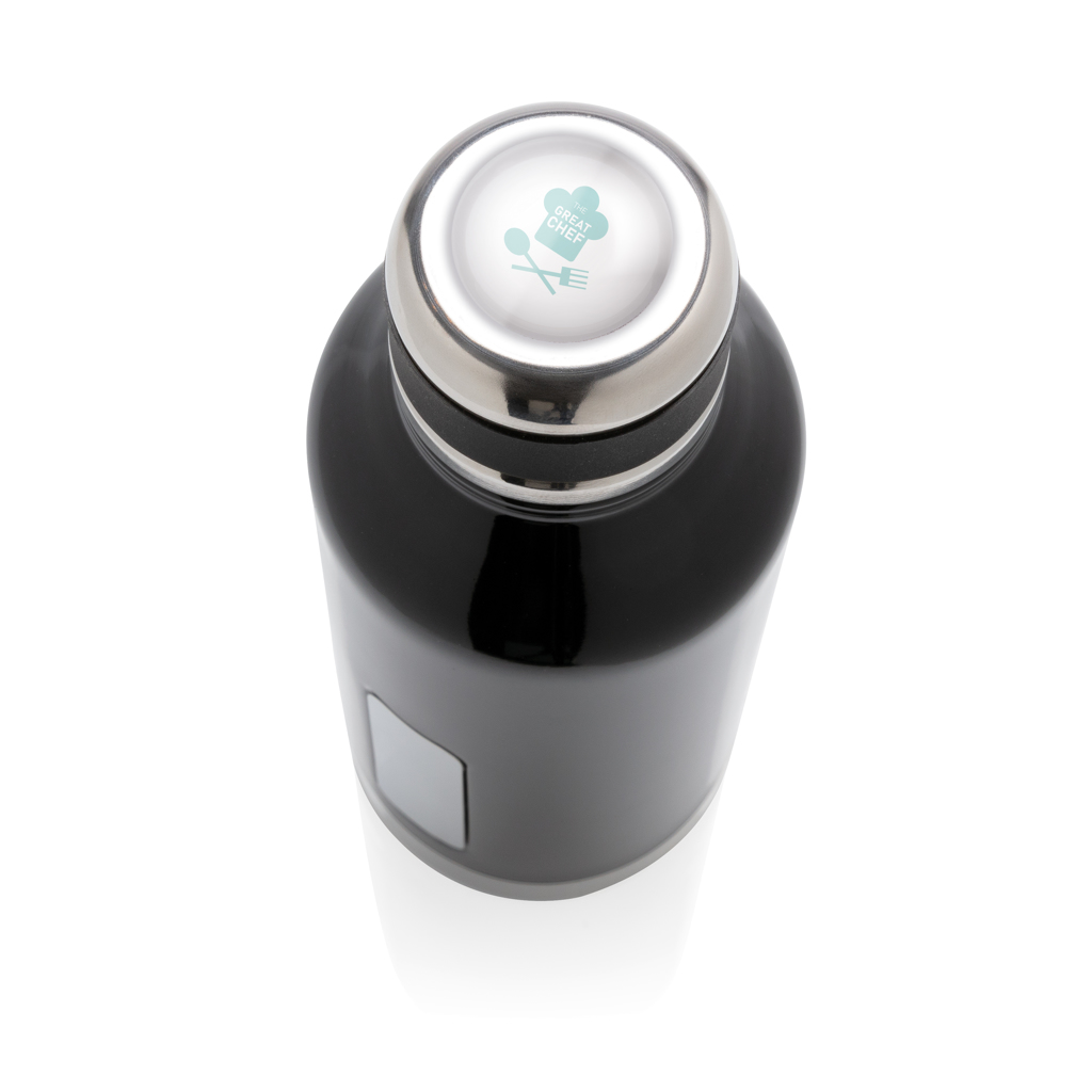 Leakproof vacuum insulated bottle with twist off lid. With unique logo position on the front. 304 stainless steel inner and 201 stainless steel outer keeps your drinks hot 5h and cold 15h. Content: 500ml.