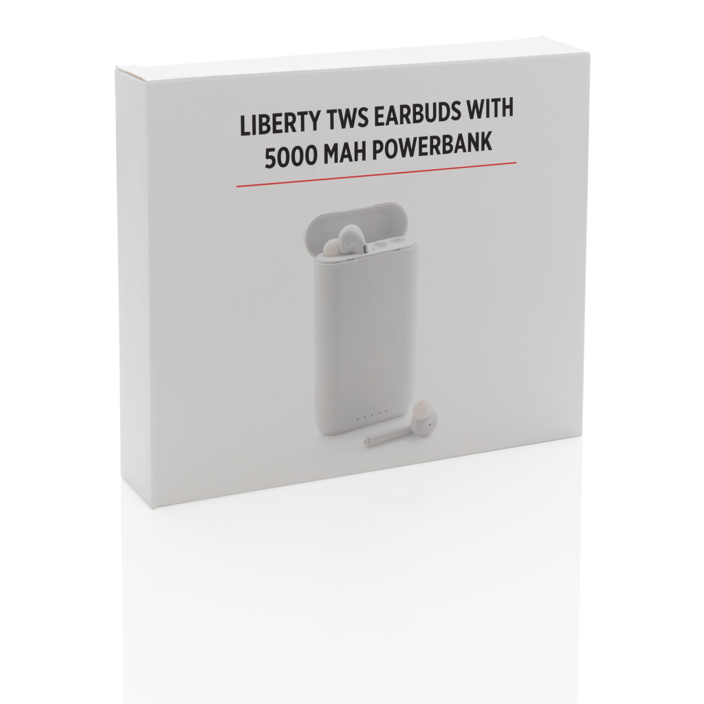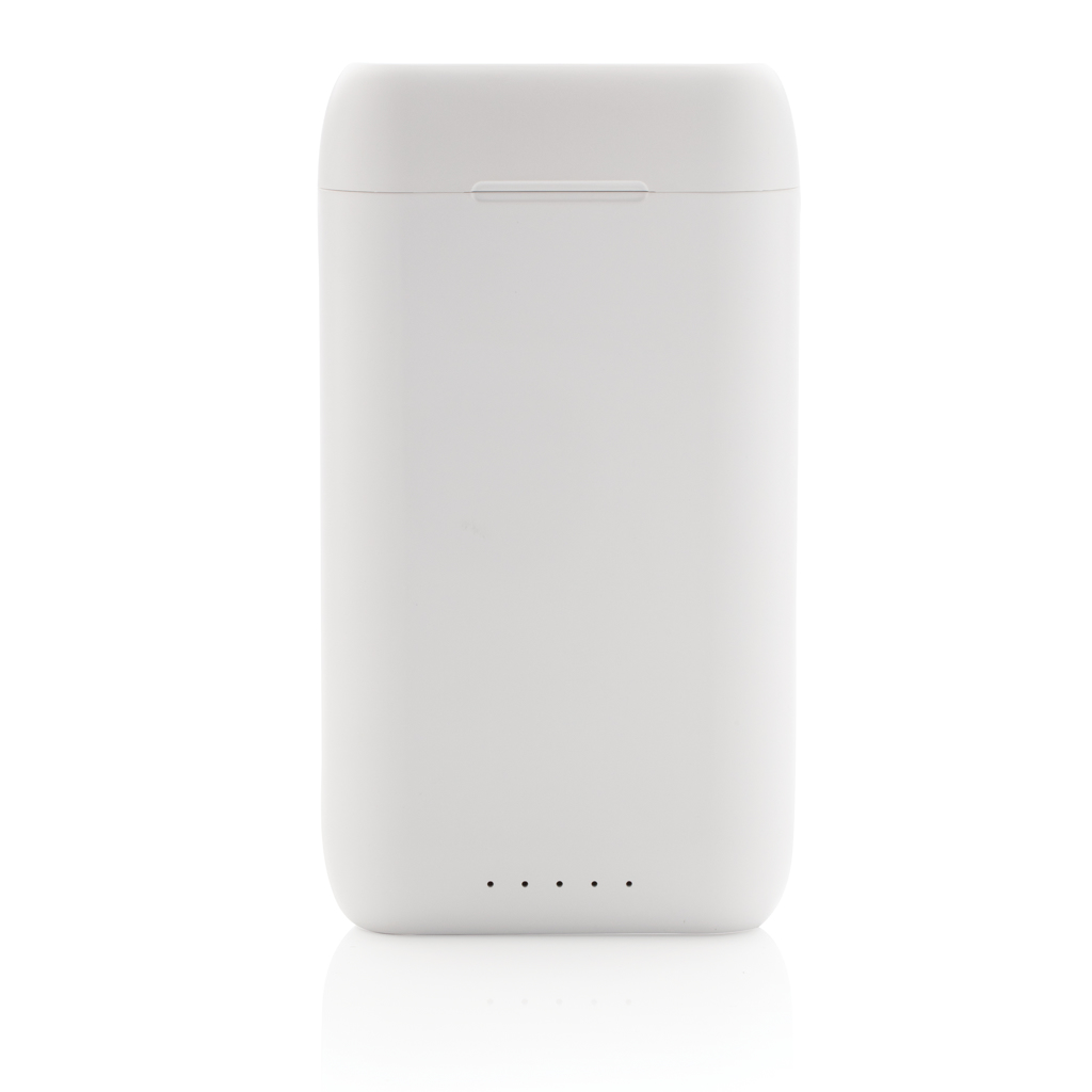 Unique 2 -in- 1 design powerbank with integrated true wireless earbuds. ABS material earbuds and casing including charging indicator light. The earbuds use BT5.0 for smooth and easy connection of the earbuds with your phone. The earbuds have a 35 mah battery that allows a play time up to 2 hours. Re-charging is done in 4 hours. Operating distance up to 10 metres. The powerbank contains a long-lasting grade A 5000 mAh lithium polymer battery that allows you to charge your mobile device up to 2 times. Type C input 5V/2A. USB output 5V/2A. Including PVC free TPE material type C cable for charging.
