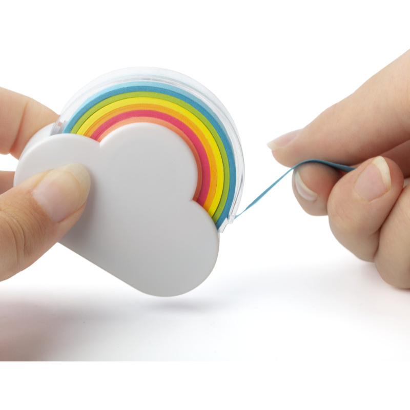 Plastic memo tape dispenser in the shape of a cloud. The cloud-shaped dispenser is white and the colours of the memo tape are blue, green, yellow, orange and pink (1 m each).