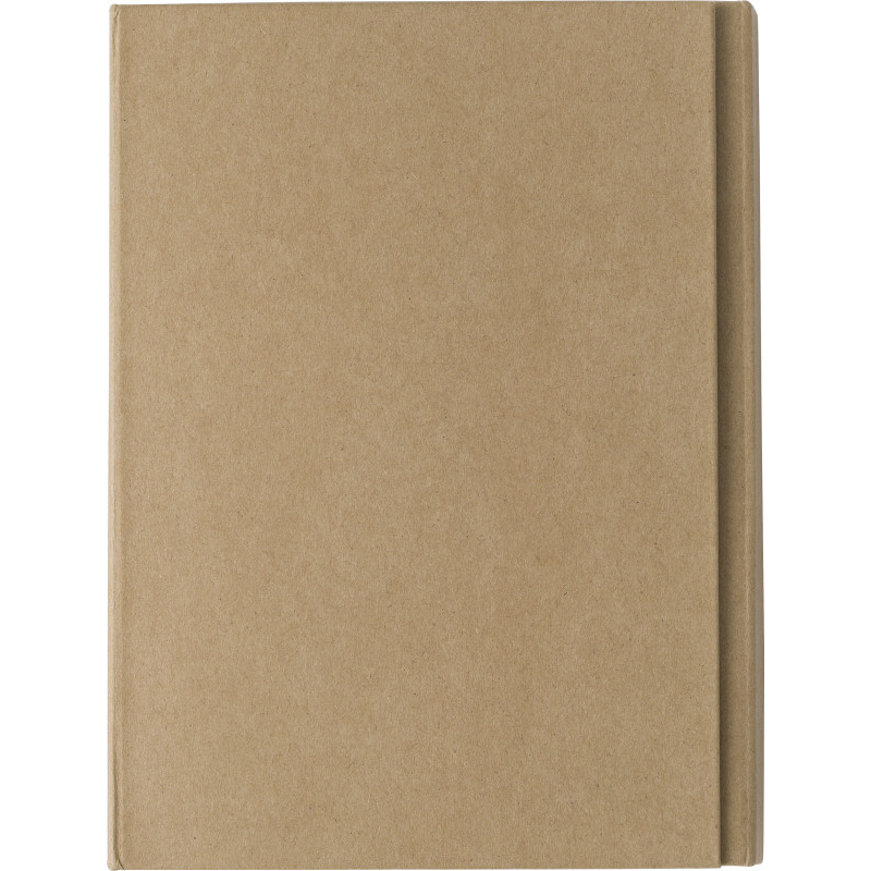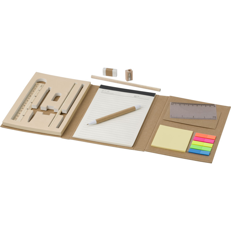 Cardboard writing folder, including: notepad with 40 sheets, bamboo ruler (15 cm), cardboard pen with plastic tip, clip and button (blue ink), two pencils, a pencil sharpener, an eraser, post-its (25 sheets per colour) and an interior pocket.