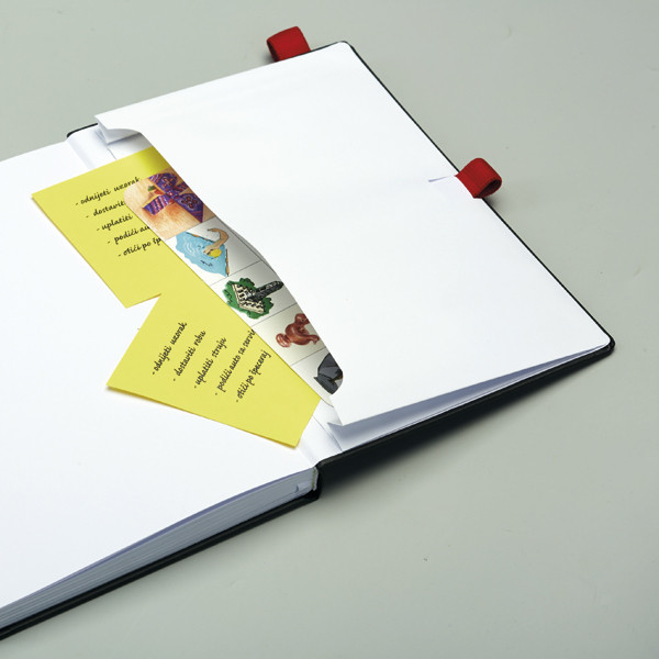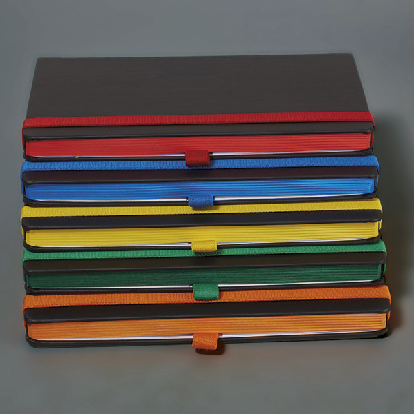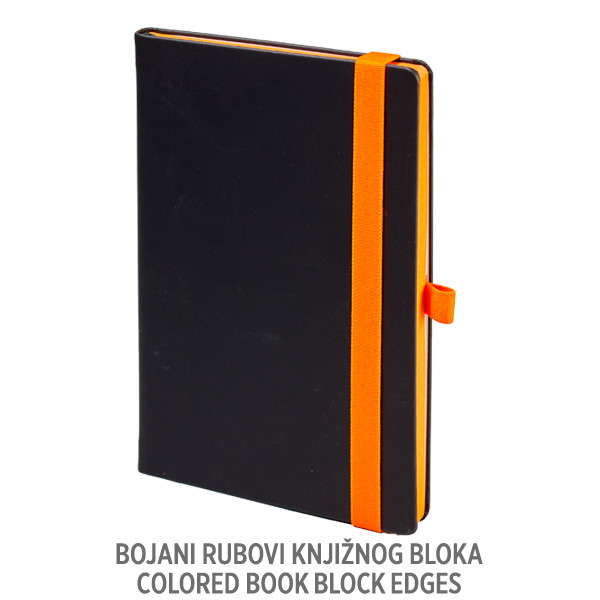 KNJIŽNI BLOK: format: 14×21 cm; opseg: 192 str.; sadržaj: osobni podaci i crtovlje; tisak: u 1 boji na bijelom papiru gramature 80 g/m²; zaobljeni uglovi; predlist, zalist i džepić tonirani u sivu boju • KORICE: korica je izrađena od koagulatnog materijala koji je preporučljiv za termo tisak, foliotisak, sitotisak i digitalni tisak; zaobljeni uglovi; gumice u raznim bojama; gumica-držač za olovke; džepić na zadnjoj unutarnjoj korici • POSEBNOSTI: bojani rubovi knjižnog bloka u boji gumice • PAKIRANJE: 20 kom.