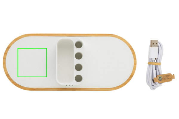 Dual 10W fast wireless charger with pen holder made with RCS (Recycled Claim Standard) certified recycled ABS. Total recycled content: 31% based on total item weight. RCS certification ensures a completely certified supply chain of the recycled materials. The base is made from FSC®100% bamboo. Wireless charging compatible with Android latest generations, iPhone 8 and up. Can charge two phones at the same time or charge any other wireless device. With 4 pen holes for storing pens/pencils and small storage for business card or other small objects. Item and accessories PVC free. Including 120 cm type C charging cable made from RCS certified recycled TPE. Packed in FSC®mix kraft box. Type-C in; Input 5V/2A; 9V/2A; Wireless output 5V/1A;9V/1.1A; (10W) Registered design®