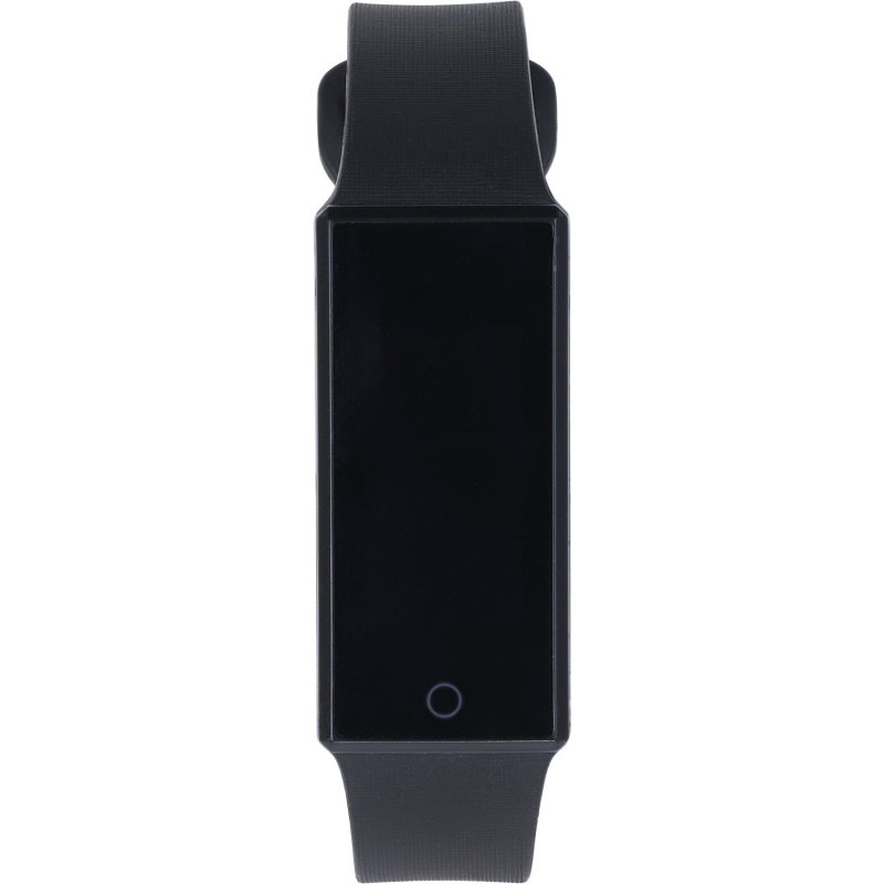 Stainless steel smartwatch with silicone strap and metal engraving plate. Displays time, counts steps & calories and tracks distance, heartrate and sleep. Screen resolution 128 x 64. Packaged in a white box.