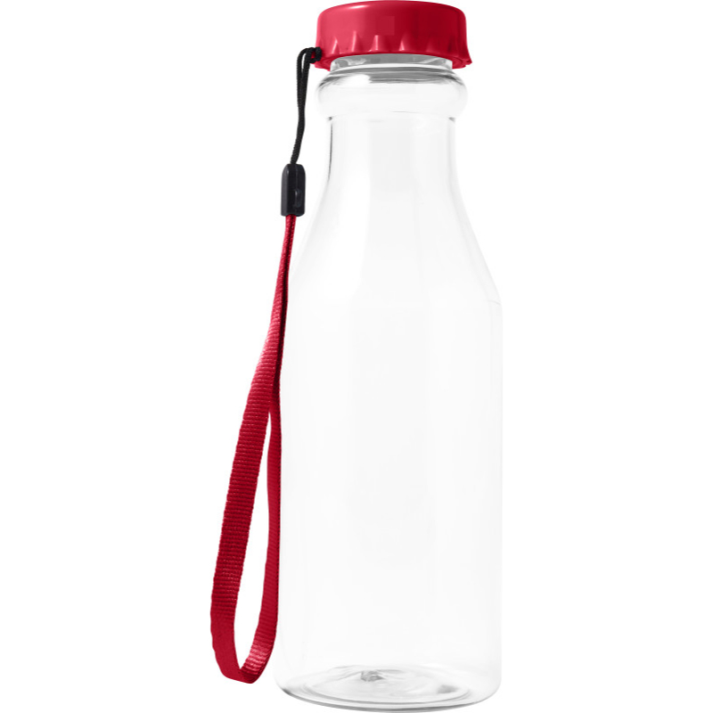 Plastic water bottle (530 ml) with imitation crown cap and carry strap.