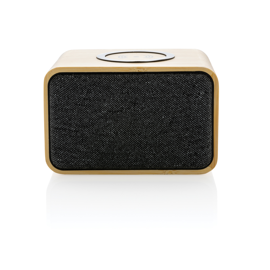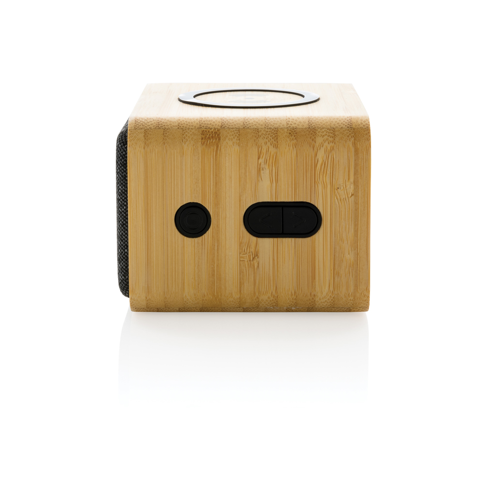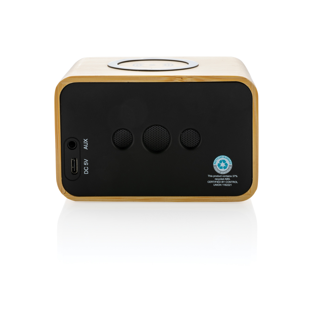 3W wireless speaker with integrated 5W wireless charger on top. Made with FSC® 100% bamboo exterior, RCS (Recycled Claim Standard) certified recycled ABS and PET. Total recycled content: 37% based on total item weight. RCS certification ensures a completely certified supply chain of the recycled materials. The speaker is equipped with a 1200 mAh battery to ensure up to 5 hours of playing time and BT5.0 for smooth connection and clear sound. Connection range up to 10 metres. With mic and pick up function to answer calls. Packed in FSC mix kraft box. Including 100 cm GRS certified recycled TPE charging cable. Item and accessories 100% PVC free.