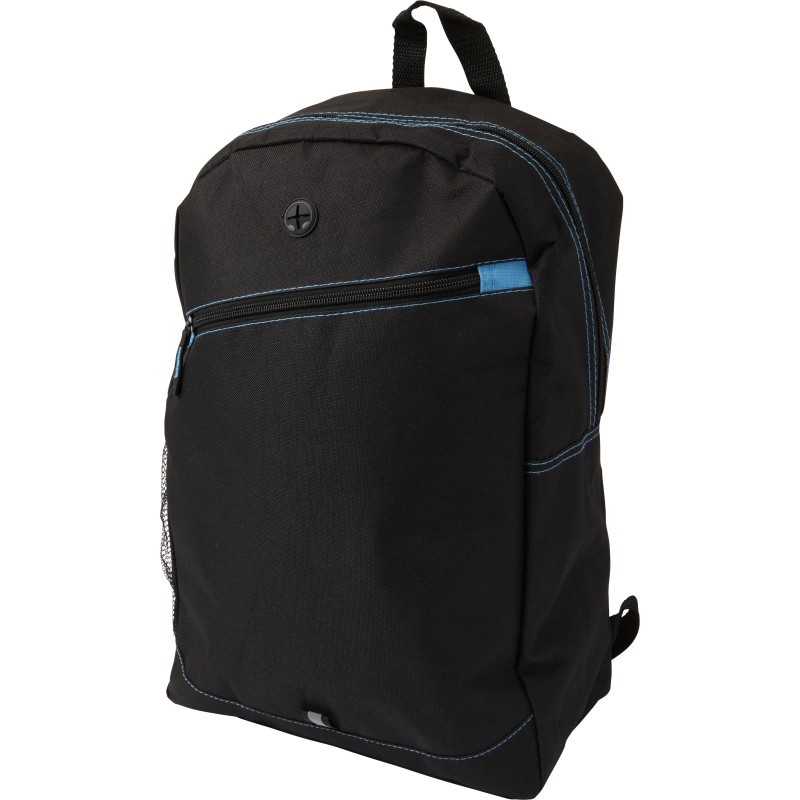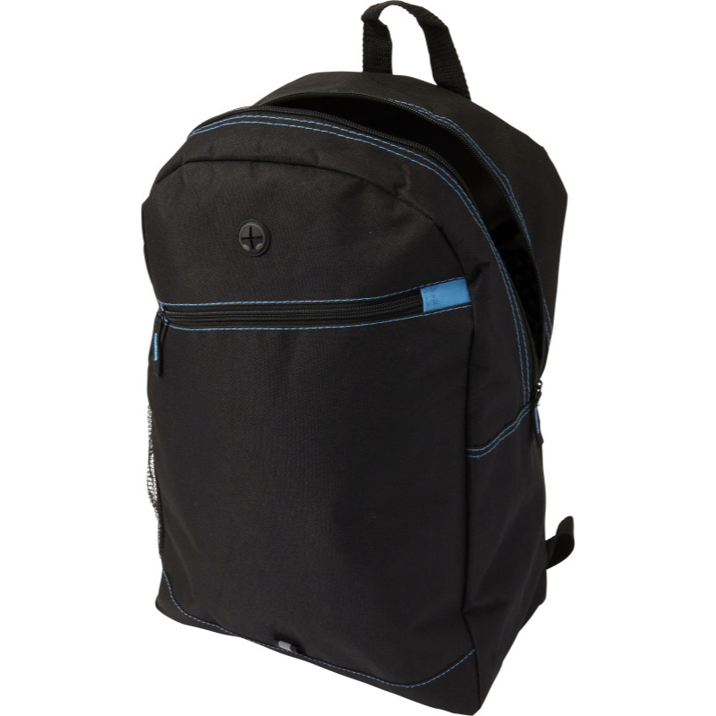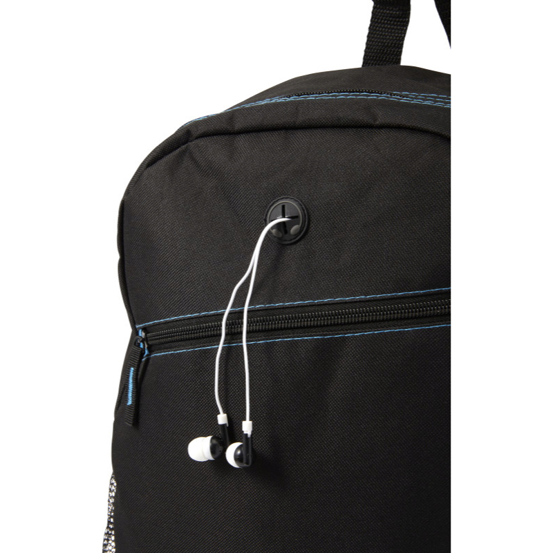 Polyester (600D) backpack with a zippered front compartment, mesh side compartment and opening for headphones. With padded adjustable shoulder straps.