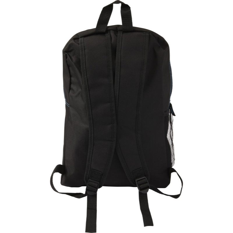 Poliesterski (600D) ruksak sa patentnim zatvaračem prednjeg pretinca, mrežastim bočnim pretincem i otvorom za slušalice. S postavljenim podesivim naramenicama.