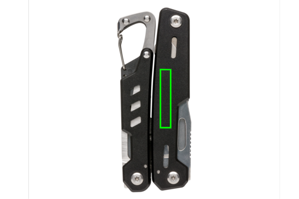 Strong and durable multitool with 11 functions. With aluminium case and stainless steel tools. Tools include: needle nose plier, regular plier, wire cutters, knife, phillips screwdriver, flat screwdriver, saw, can opener, bottle opener, wire stripper, carabiner. Packed in gift box.
