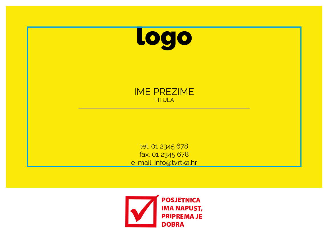 PLAVI OKVIR na skici predstavlja preporučenu udaljenost teksta od ruba vizitkarte.