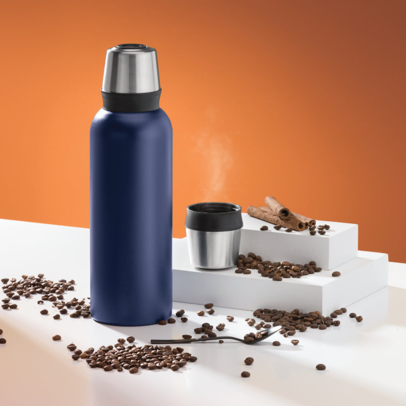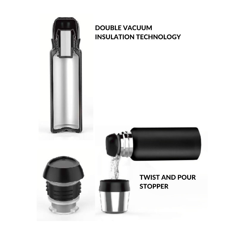 Čvrsta vakuumska boca izrađena od najkvalitetnijeg prehrambenog čelika 18/8, otpornog na kiseline i karbonate. Termosica s izvrsnim izolacijskim svojstvima održava idealnu temperaturu napitaka duge sate. Termosica se sastoji od dvije vakuumske stijenke izrađene od nehrđajućeg čelika, koje savršeno izoliraju sadržaj termosice od temperature okoline. Visoku temperaturu održava do 12 sati, a nisku do 24 sata. Dvostruke stijenke termos boce ne zagrijavaju se, što osigurava udobnost korištenja. Premaz u prahu osigurava čvrsto držanje i izvrstan izgled. Kako biste napunili šalicu, lagano odvrnite trokutasti čep i nagnite termosicu.