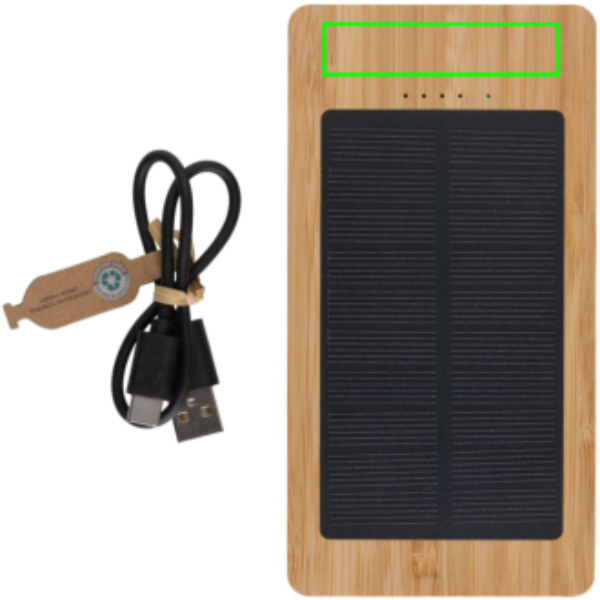10.000 mAh solar powerbank made with FSC 100% bamboo. The powerbank uses high quality monocrystalline solar panels with 19% conversion rate. Charge rate depends on conditions. The powerbank contains a long lasting grade A 10.000 mAh lithium battery. Charging speed solar: 5V/180mA. Input type C: 5V/2A. Output: USB A: 5V/2A Type C: 5V/2A. Item and accessories PVC free. Including RCS certified recycled TPE charging cable. Packed in FSC® mix packaging.