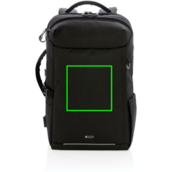 This carry-on travel backpack is intended for overnight or weekend trips. It is designed with a padded 17″ laptop compartment to protect your device. This style has the capacity of a trolley without the weight of the wheels and handle, plus using a backpack makes you more mobile, hands-free and simplifies your travel experience. Leave your wheels at home and travel easily. Including trolley strap, water bottle side pocket and USB A output. Top quick access pocket, front zippered pocket and RFID protected pockets. With AWARE™ tracer that validates the genuine use of recycled materials. Each bag has reused 35.5 0.5L PET bottles. 2% of proceeds of each Impact product sold will be donated to Water.org. PVC free.