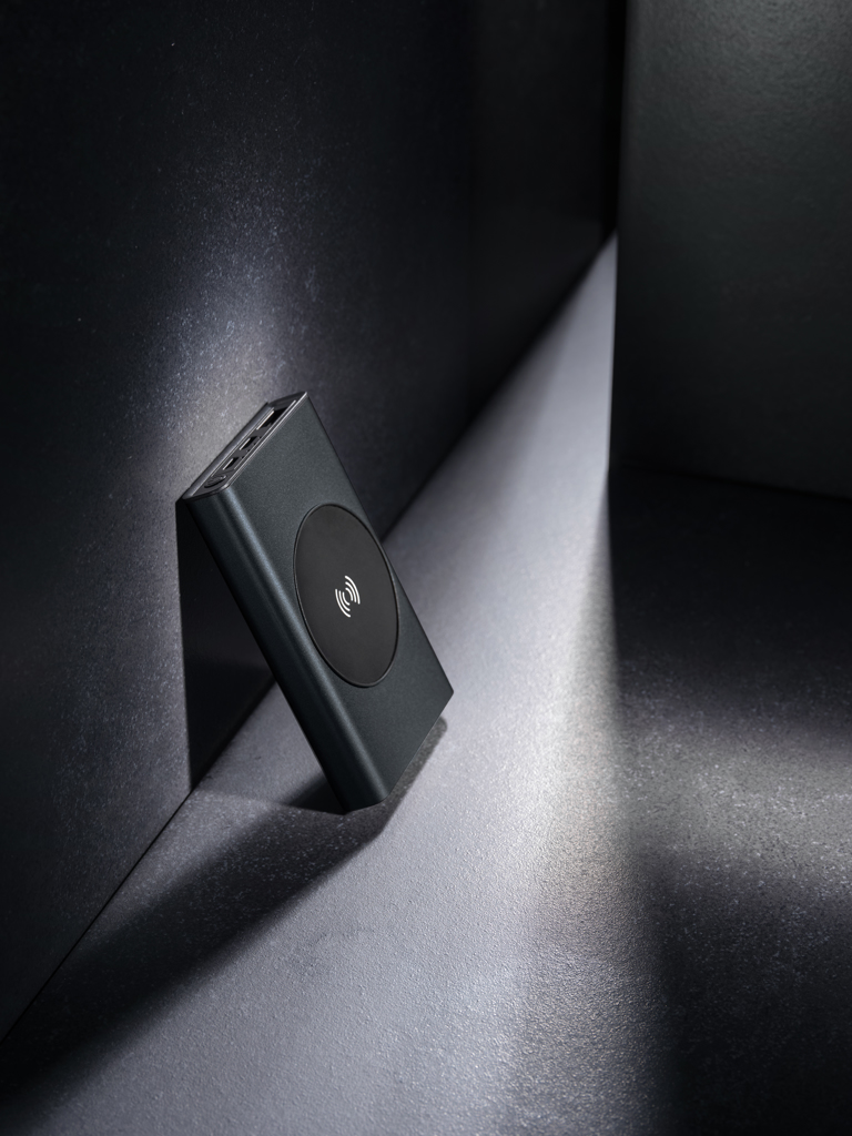 Powerbank made with RCS (Recycled Claim Standard) certified recycled aluminium and ABS. Total recycled content: 31 % based on total item weight. RCS certification ensures a completely certified supply chain of the recycled materials. Aluminium does not lose its characteristics in the recycling process and can be recycled endlessly. The powerbank contains a long-lasting grade A 5000 mAh lithium polymer battery. The wireless charger supports wireless charging up to 5W. The power indicators will indicate the remaining energy level so you always know when to re-charge. Item and accessories 100% PVC free. Including type C charging cable made from RCS certified recycled aluminium, TPE and PET. Packed in FSC® mix packaging. USB output 5/2.4A, Type C output: 5V/2.4A. Type C input: 2.4A. Micro USB input: 5V/2A.