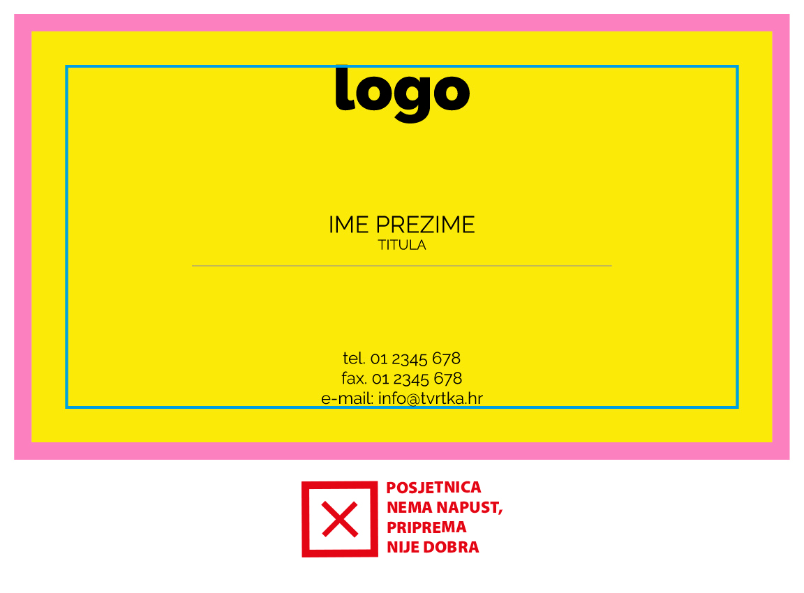 PLAVI OKVIR na skici predstavlja preporučenu udaljenost teksta od ruba vizitkarte.
