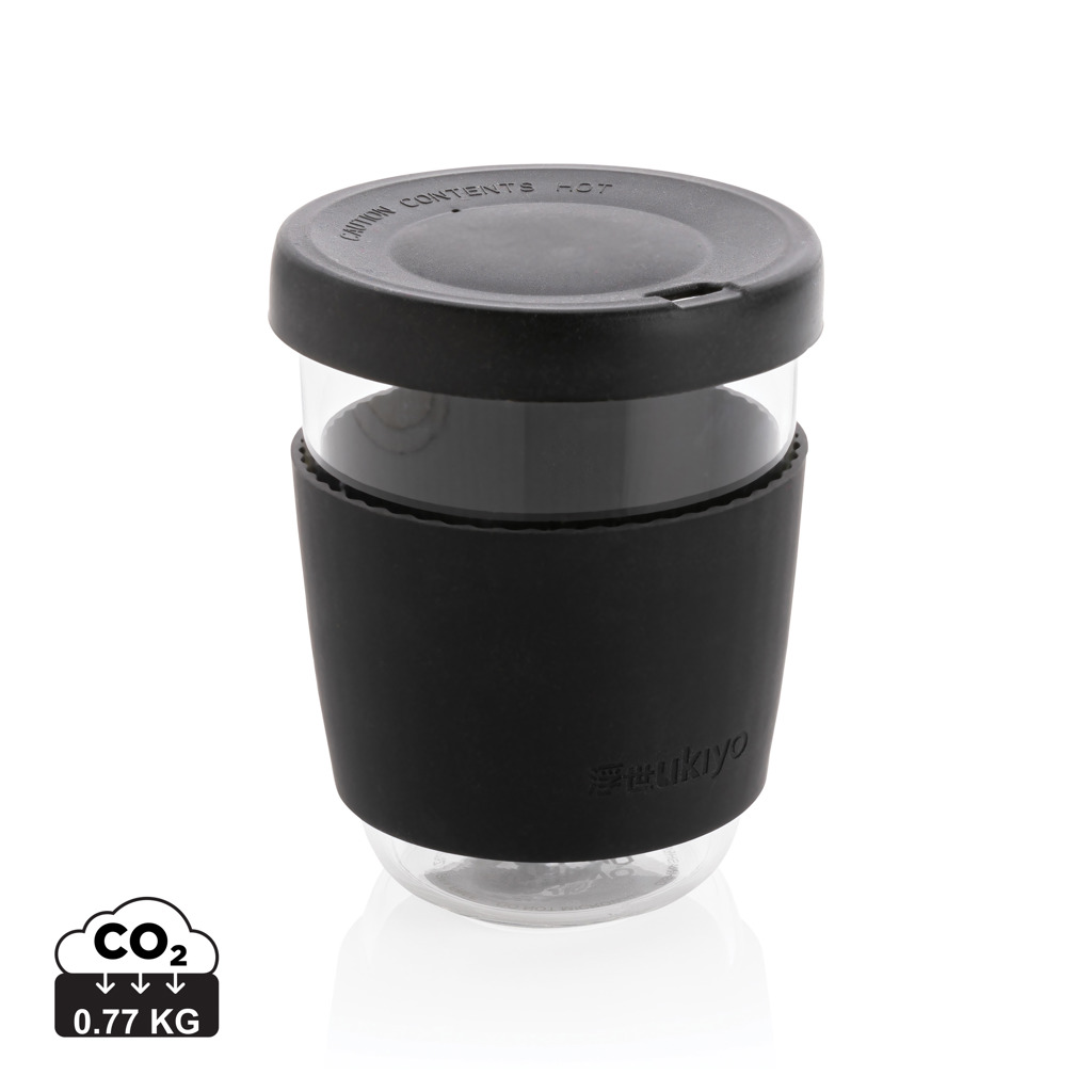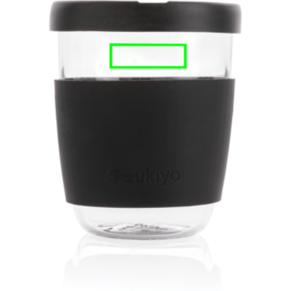 Enjoy your coffee at work or at home in this Ukiyo borosilicate glass with silicone lid and sleeve. The cup has a nice grip and a slim shape. A small vent in the lid allows steam to escape to prevent pressure build-up. BPA free. Capacity 360ml.