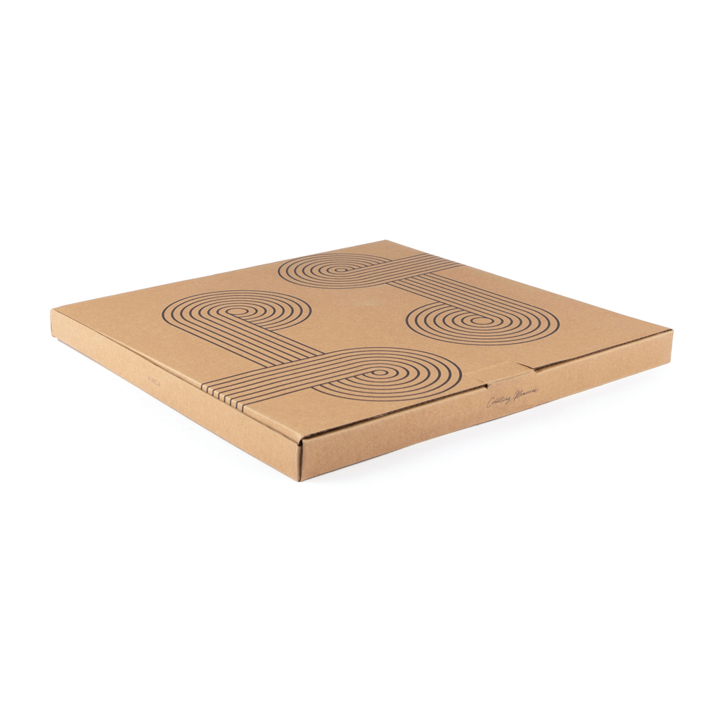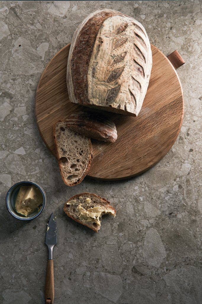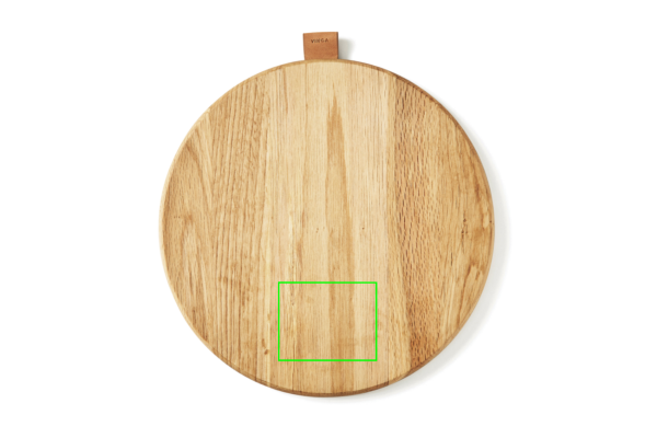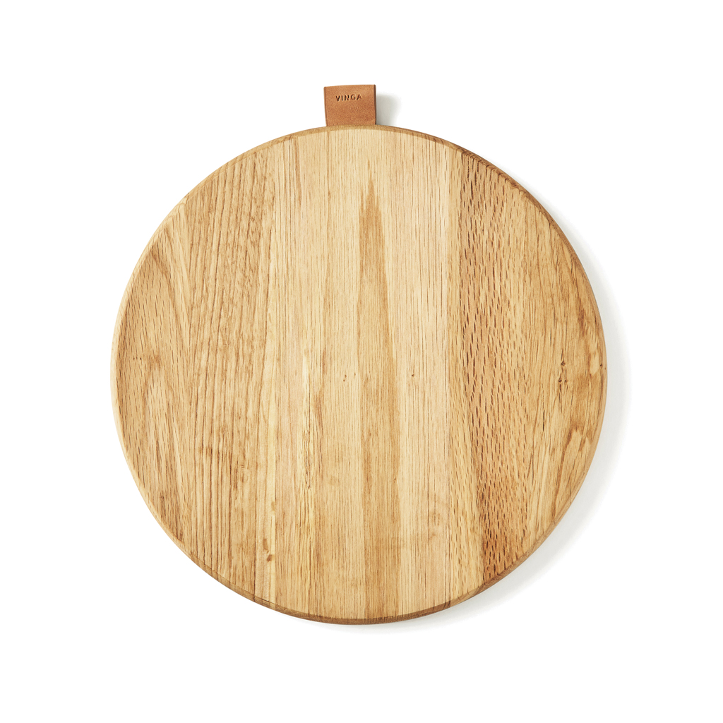 Exclusive oak serving board with a fine faux leather detail. Excellent for serving and, when not in use, the cutting board is a nice detail on the kitchen counter.