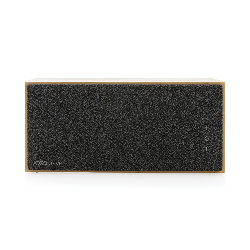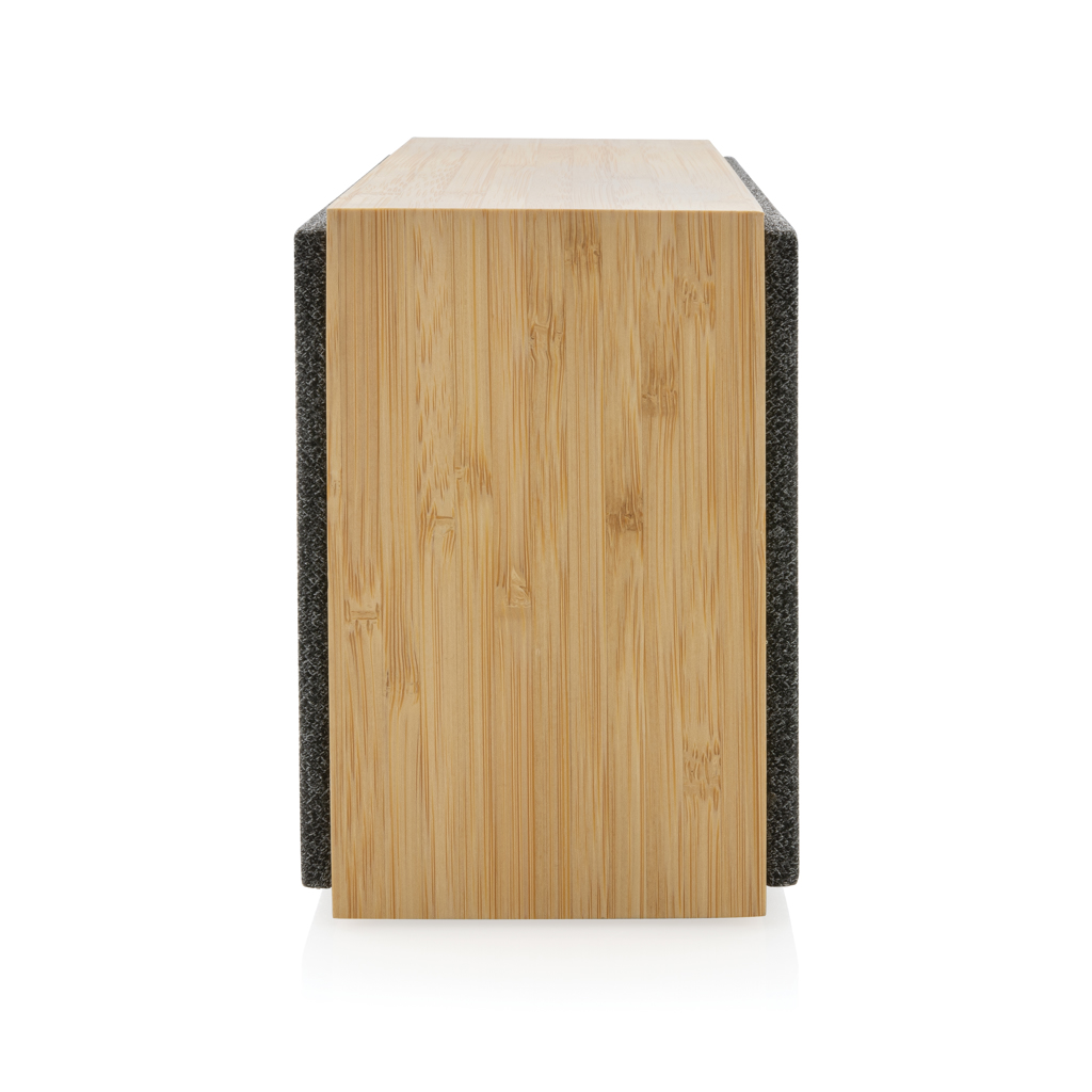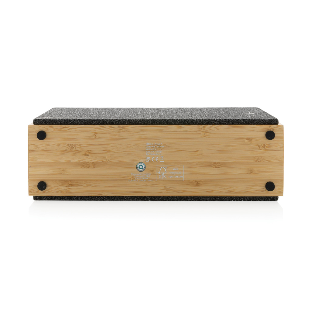 Luxury and powerful 20W speaker with clear sound and strong bass. The outer casing is made from FSC 100% certified bamboo. The plastic components are made with RCS (Recycled Claim Standard) certified recycled ABS. Total recycled content: 17 % based on total item weight. RCS certification ensures a completely certified supply chain of the recycled materials. The speaker comes with BT 5.1 for easy and smooth operation up to 10 metres and low power consumption. The 1200 mah battery allows a playtime up to 6 hours and can be fully re-charged in 3 hours. With pick up function and mic to answer (video) calls. Packed in FSC mix kraft box. Including RCS certified recycled TPE charging cable.